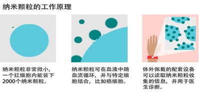 Google正在开发一种新技术,将能够检测疾病的纳米颗粒和腕带式传感器结合。这种纳米颗粒可以通过胶囊口服后进入病人血液,探测人体生化指标的轻微变化,来作为对疾病的早期预警系统。目前,这一项目还处于初步研发阶段。
