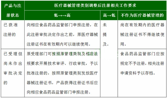 自本文件发布之日起,管理类别调整为高类的,对已经获准注册的医疗器械产品,应向相应食品药品监管部门申报注册,在此注册审批决定作出之前,原医疗器械注册证书在有效期内可以继续使用;已受理但尚未作出审批决定的医疗器械产品,原受理部门可按照原管理类别及相应法规要求开展技术审评、行政审批,予以批准注册的,按照原管理类别发放医疗器械注册证书,产品获得注册证书后应向相应食品药品监管部门申报注册。